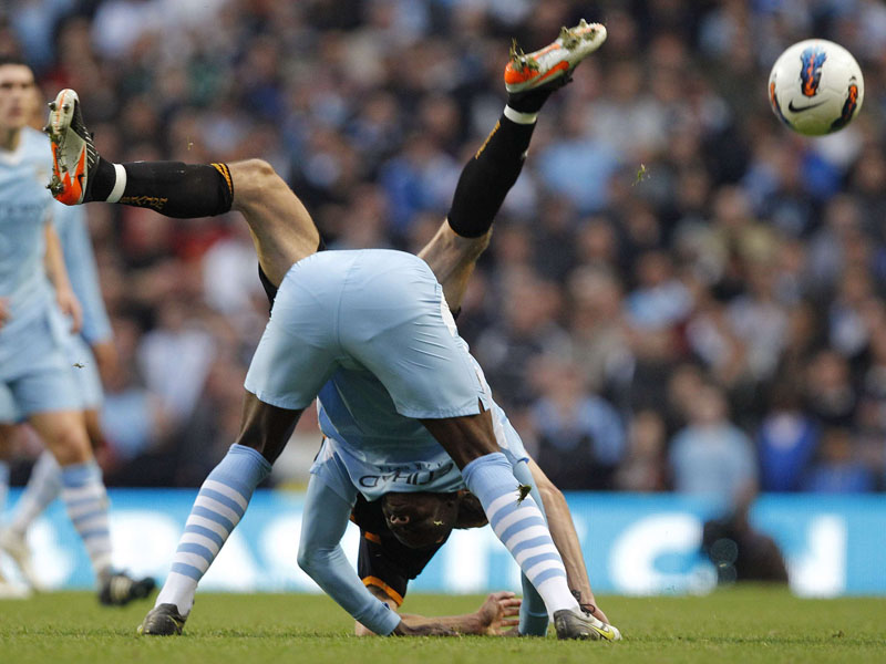 6. Mario Balotelli dihadang pemain Wolverhampton Wanderers saat pertandingan English Premier League di Stadion Etihad, Manchester, Kamis (29/10/2011). Foto: REUTERS/Phil Noble